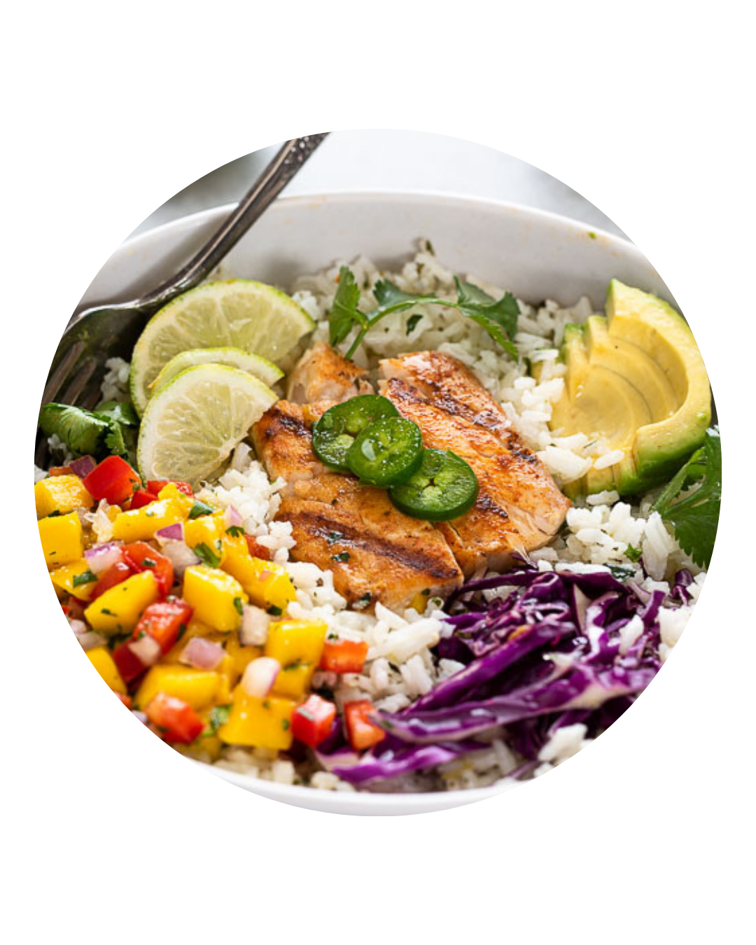 Seasoned grilled fish over cilantro rice with fresh slaw, pico, and house sauce.